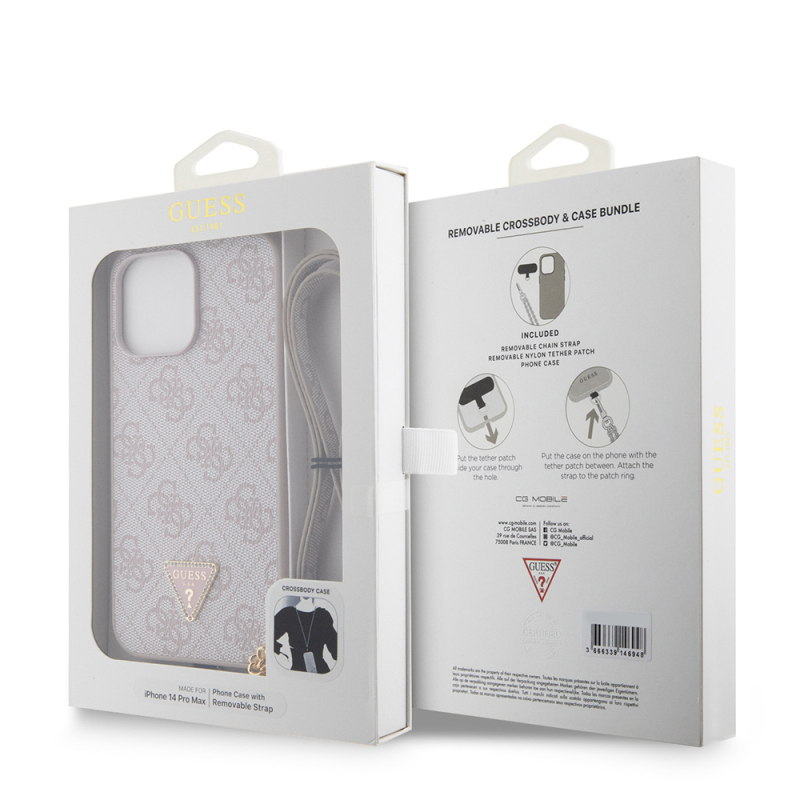 Apple iPhone 14 Pro Max Case Guess Original Licensed PU Leather Stone Metal Triangle Logo Crossbody Strap 4G Patterned Cover