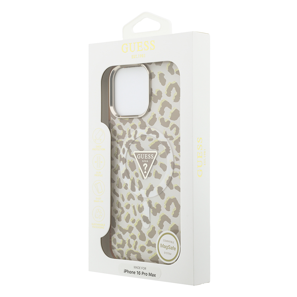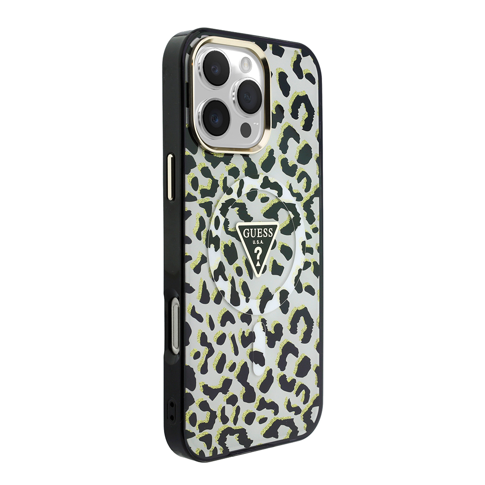 Apple iPhone 16 Pro Max Case Guess Original Licensed M-safe Charging Enabled Triangle Logo Glitter Leopard Pattern Cover