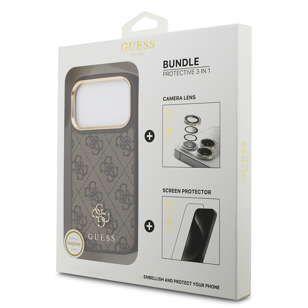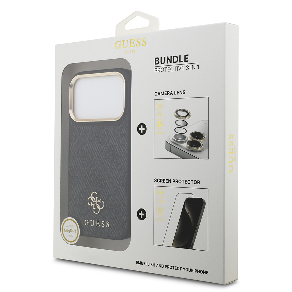 iPhone 17 Pro Guess Orjinal Lisanslı 4G ve Yazı Logolu Kılıf + Ekran Koruyucu + Lens Koruyucu 3in1 Aksesuar Seti