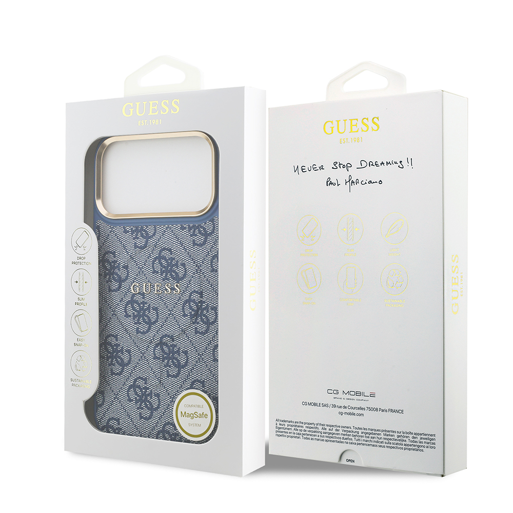 Apple iPhone 17 Pro Max Case Guess Original Licensed M-safe Charging Feature Gold Metal Camera Frame PU Leather 4G Patterned Text Logo Cover