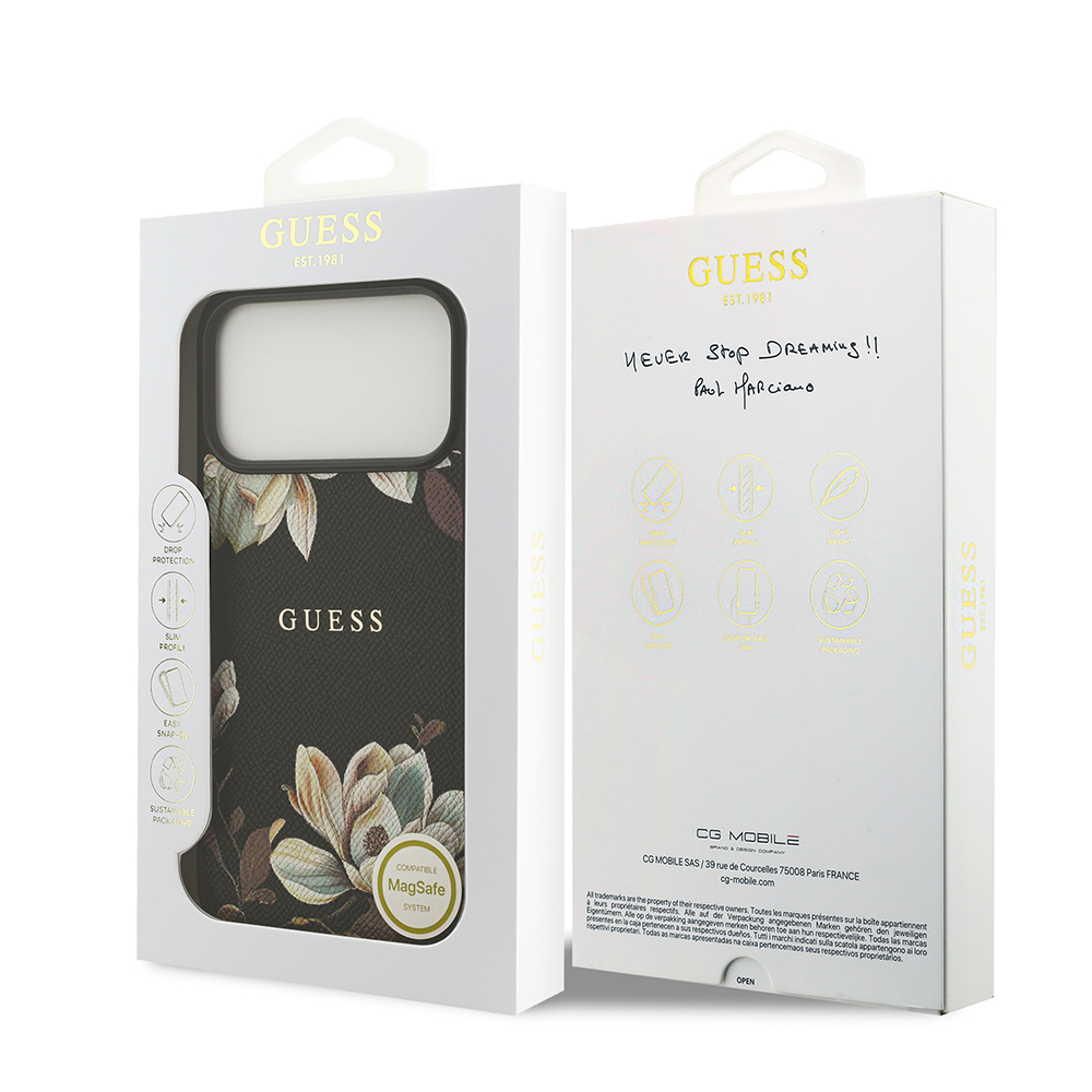 Apple iPhone 17 Pro Max Case Guess Original Licensed M-Safe Charging Feature Grained Flower Design Metal Lettering Logo Cover