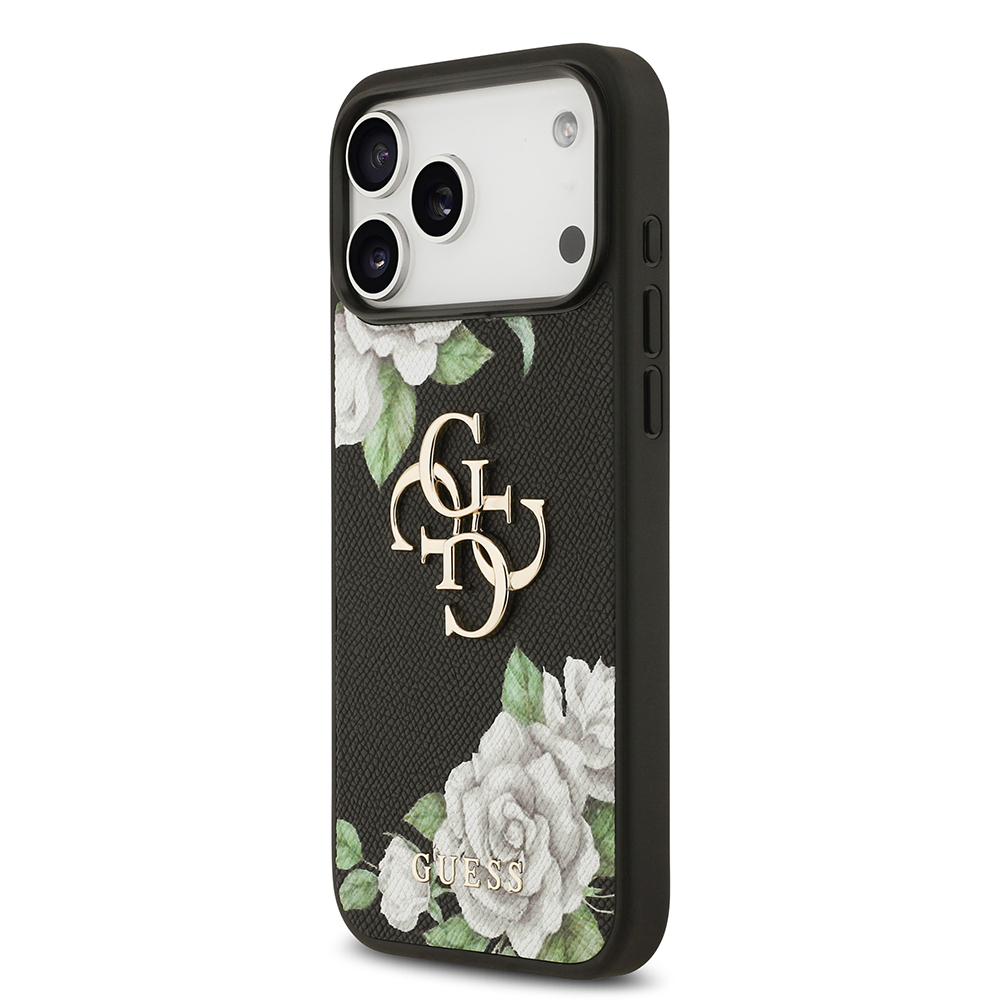 Apple iPhone 17 Pro Max Case Guess Original Licensed Rose Printed Large Metal Logo Design Cover
