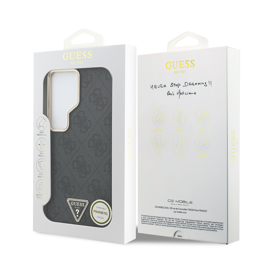 Guess Galaxy S26 Ultra Case Original Licensed M-safe Charging Enabled Gold Metal Camera Frame Rhinestone Triangle Logo 4G Patterned Cover